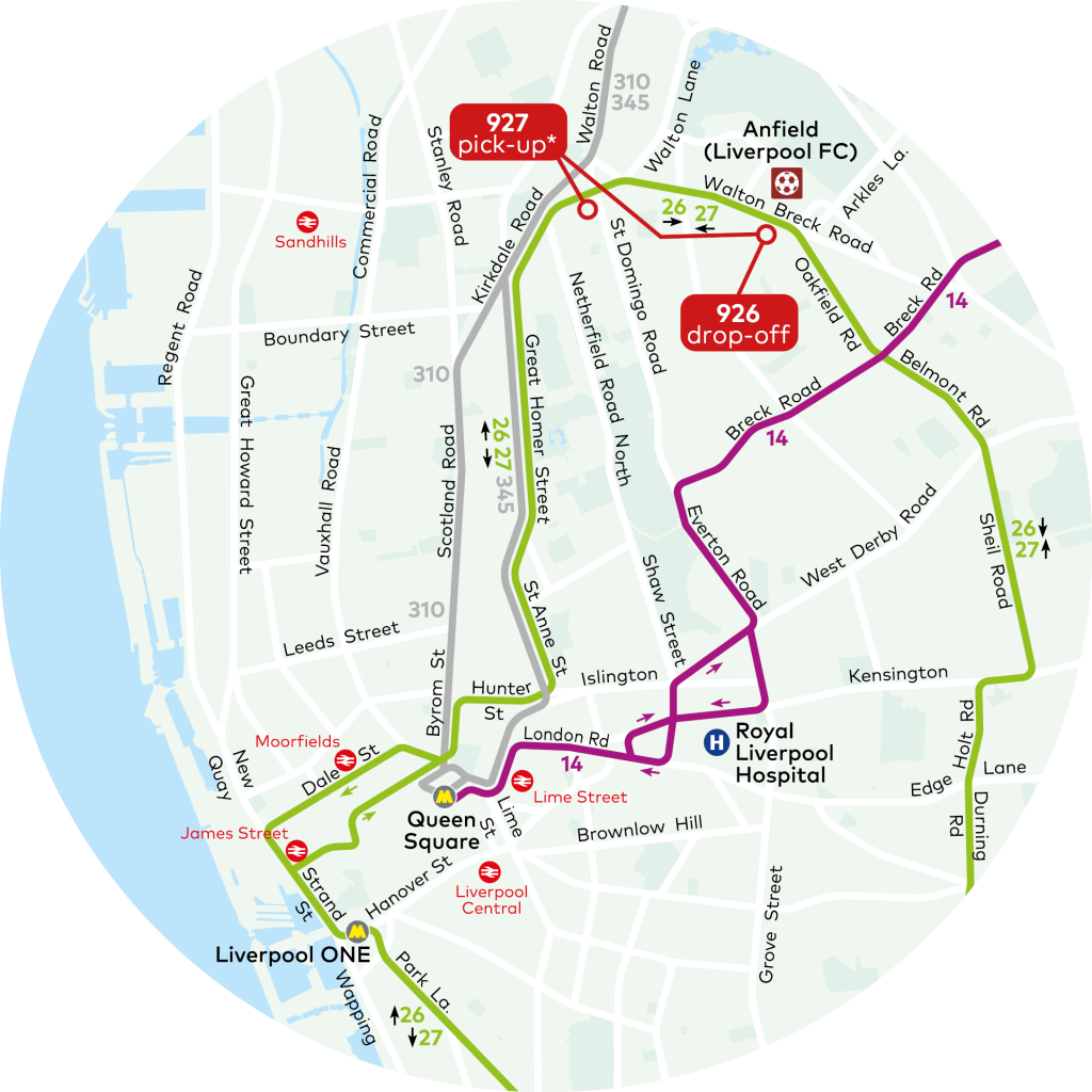 *St Domingo stop used for 927 from 1st bus, pick-up changes to outside Anfield once road closures are lifted (normally around 45 minutes after final whistle or event finish).